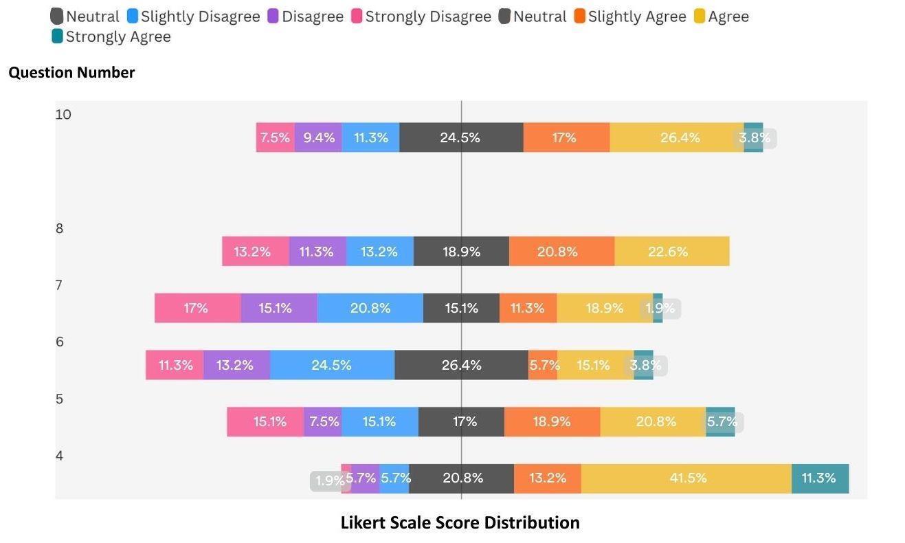 The sample size for the survey was 53, with a mean age of 24.06, and area of residence, including 23 distinct regions in China, with Shanghai being the most recurring (20 participants lived in Shanghai). The following figure summarizes the distributions of Likert scale results.