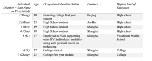 The inclusion criteria for interview participants were individuals who are BVI and have undergone education in China. The survey, on the other hand, has a population that includes all BVI individuals in China. Participants were sampled through volunteer and snowball sampling online. There were 53 total respondents. Participants all gave consent before participating in either the interview or survey. The data has also been anonymized, with each participant represented by a numerical value.