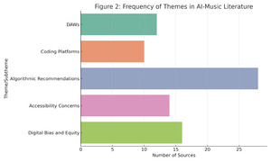 Figure 1 illustrates not only the distribution of themes across the 80 selected sources but also reveals which areas dominate contemporary AI-music scholarship. The most frequently occurring theme is Algorithmic Recommendations, appearing in nearly 30 sources. This concentration suggests that current research is heavily invested in understanding how AI shapes listening behavior, influences user preferences, and mediates power relations between platforms and listeners. In contrast, Generative AI for Music Composition is split across two subthemes, DAWs and coding platforms, with each receiving moderate but comparable attention. This indicates that scholars view AI-assisted creativity as multidimensional, spanning both consumer-facing music production tools and more technical, code-based environments. The theme Ethical Implications (accessibility concerns + digital bias) appears less frequently than algorithmic recommendations but still occupies a substantial portion of the dataset. This distribution highlights that while ethical concerns are present in the field, they are often treated as secondary to technical or user-experience questions. Taken together, the figure demonstrates that although the field is expanding in multiple directions, scholarly attention is unevenly distributed, with recommendation algorithms receiving the most sustained focus.