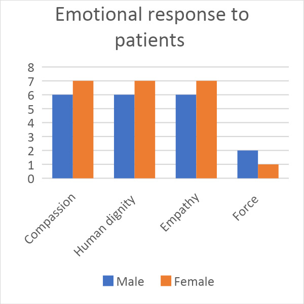 The findings also reveal a sense of empathy for patients and feelings of frustration about the well-being treatment protocol. 0-8 was the rating with 8 being the strongest value. When the EMS workers were asked about what was most important for them as they treated patients in situations of incarceration- the overwhelming data reveals a strong correlation with compassion, human dignity and empathy for the patient. Force was the weakest variable for both male and female workers. These preliminary findings of the short impact of forced hospitalization elucidate the controversial nature of the policy. It also reveals the human side of these cases and the complexities of public health.