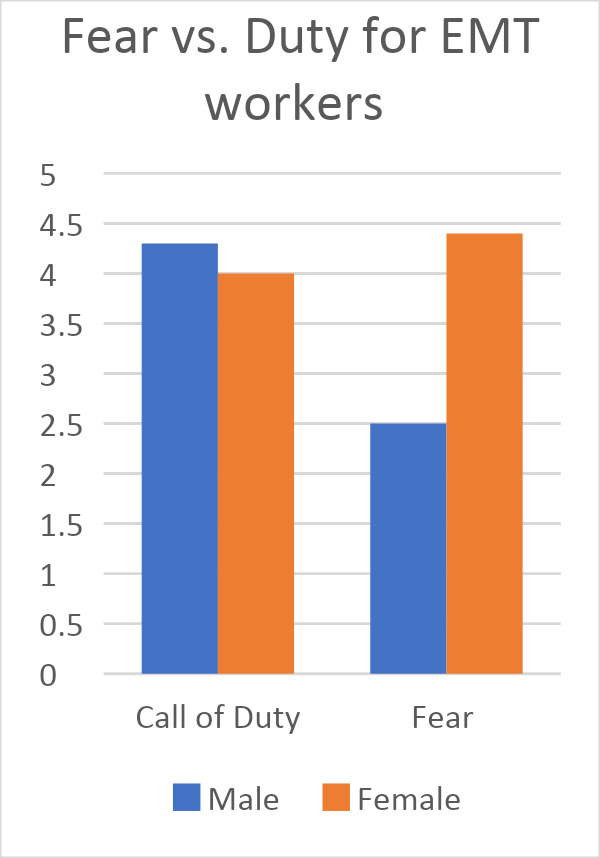 The responses of the 10 ambulatory crew members revealed a tension between the call of duty and fear for their safety as an emotional response during their ambulatory shifts. 0-5 was the rating with 5 being the strongest value. The below chart reveals a stronger emotion of fear for female EMT workers and a comparable level for both male and female EMT workers for call of duty.